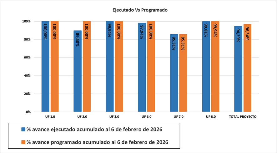 El avance real ponderado para todo el proyecto a 6 febrero de 2026 es del 94.39% el cual se ve reflejado de manera particular para cada Unidad Funcional de acuerdo con la siguiente gráfica:
