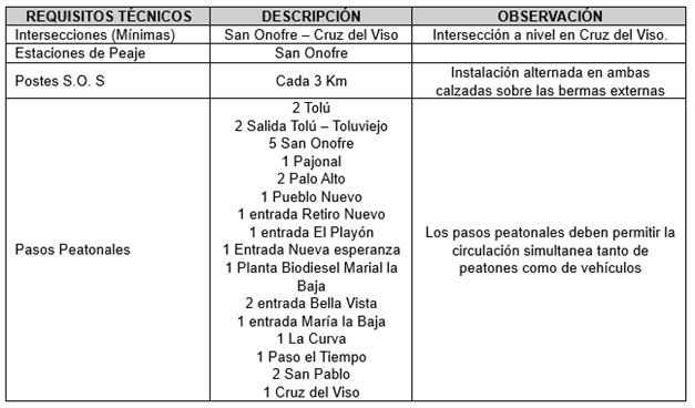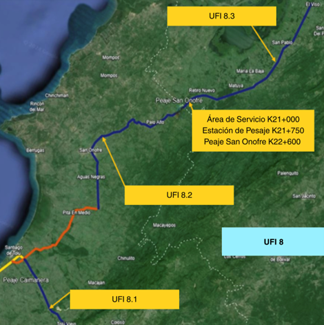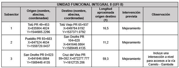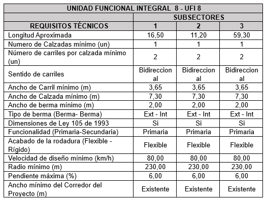 Unidad Funcional Integral 8 Inicio Quienes Somos Proyecto Información de Avance Unidad Funcional Integral 1 Unidad Funcional Integral 2 Unidad Funcional Integral 3 Unidad Funcional Integral 4 Unidad Funcional Integral 5 Unidad Funcional Integral 6 Unidad Funcional Integral 7 Unidad Funcional Integral 8 Proyecto de Concesión Documentación Documentos Públicos Acceso Restringido Contacto X Unidad Funcional Integral (UFI) 8: Tolú – Tolú Viejo; Pueblito – Cruz del Viso Descripción de la Unidad Funcional Integral 8 Apéndice 1- Contrato de Concesión La Unidad Funcional tiene las siguientes características geométricas y requisitos técnicos: Características Geométricas y Técnicas UFI 8 Fuente: Apéndice 1- Pliegos Concesionario Otros Requerimientos Técnicos Unidad Funcional 8 A raíz de la suscripción del Otrosí No.16 al Contrato de Concesión, se realizaron modificaciones en la tipología de los pasos peatonales proyectados.
